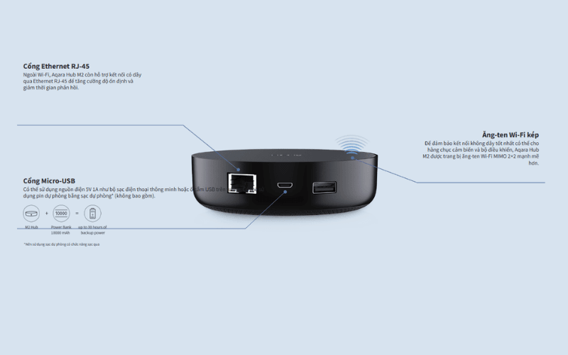Hub M200 sử dụng nguồn 5V – 1A qua cổng Micro-USB, đồng thời hỗ trợ pin dự phòng thông qua Power Bank – đảm bảo hệ thống nhà thông minh của bạn luôn hoạt động ngay cả khi mất điện.