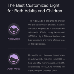 Đèn bàn thông minh Mi có có thêm chế độ đình chỉnh ánh sáng phù hợp với trẻ em. Đối với trẻ em thì sự phát triển của chúng vẫn chưa hoàn thiện. Vì vậy chúng ta cần cho trẻ một chế độ ánh sánh thích hợp của ánh sáng.