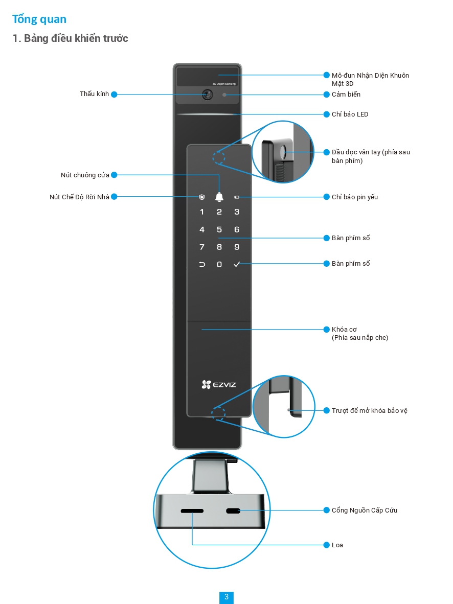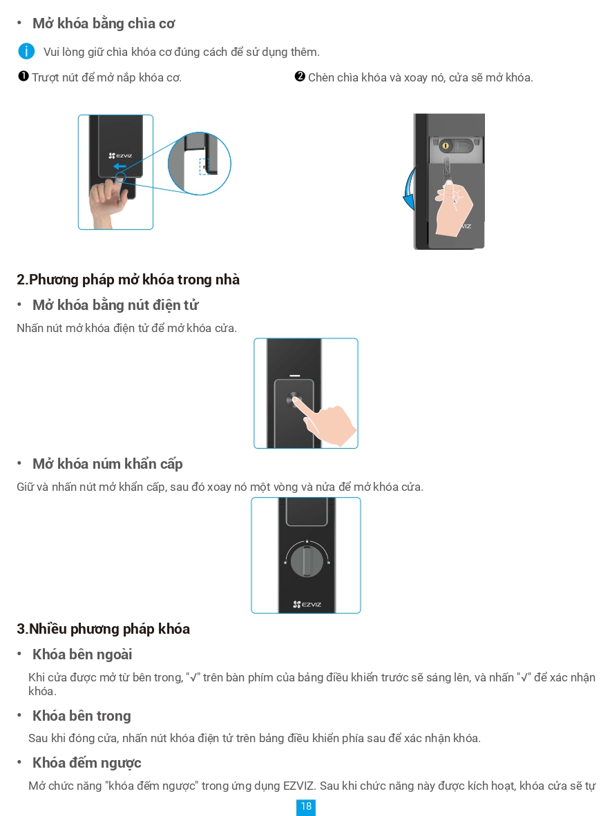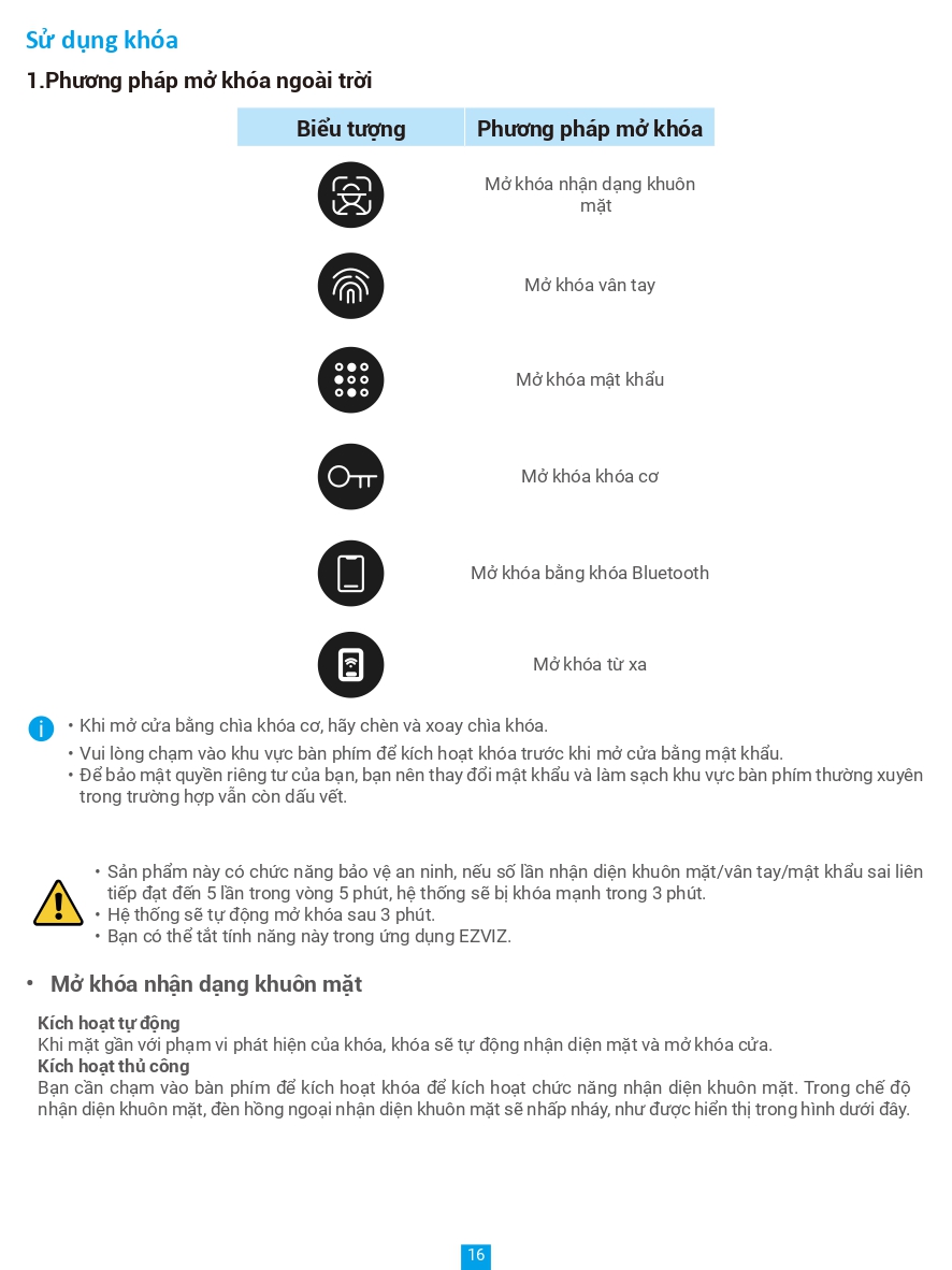 – Nhiều chế độ mở khóa: Khuôn mặt, vân tay, mật mã, chìa cơ, chìa bluetooth, qua ứng dụng EZVIZ, mã tạm thời, mở khóa từ xa