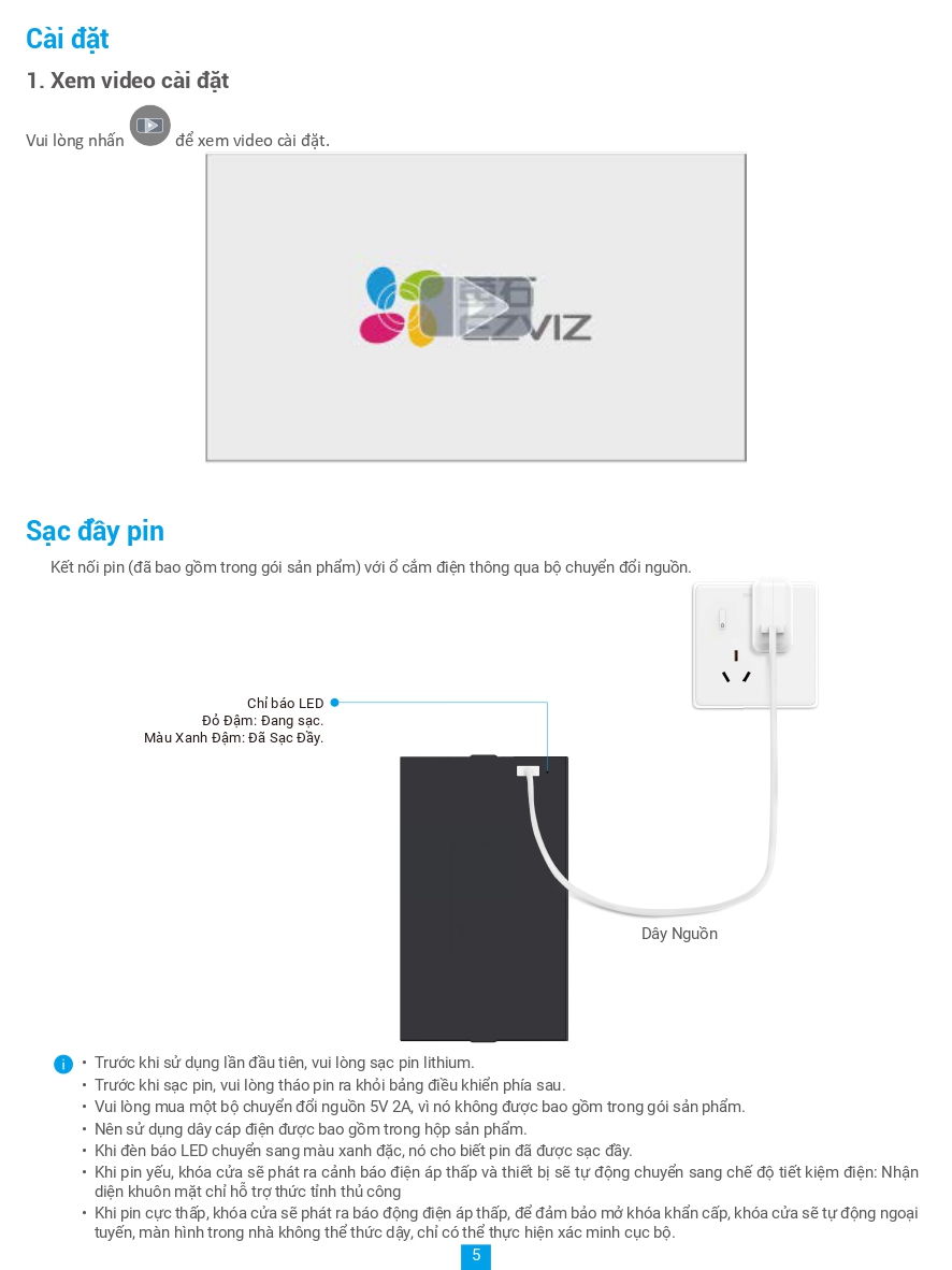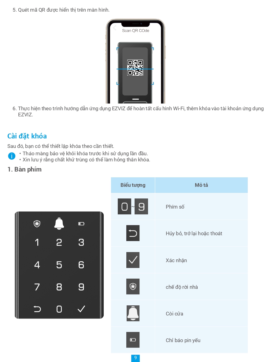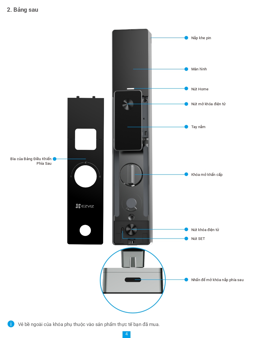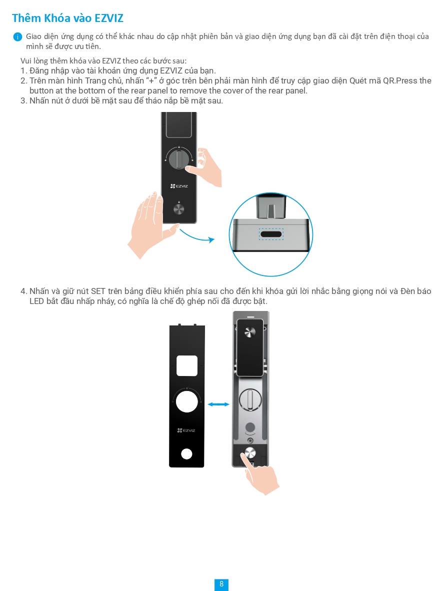 – Nhiều chế độ mở khóa: Khuôn mặt, vân tay, mật mã, chìa cơ, chìa bluetooth, qua ứng dụng EZVIZ, mã tạm thời, mở khóa từ xa