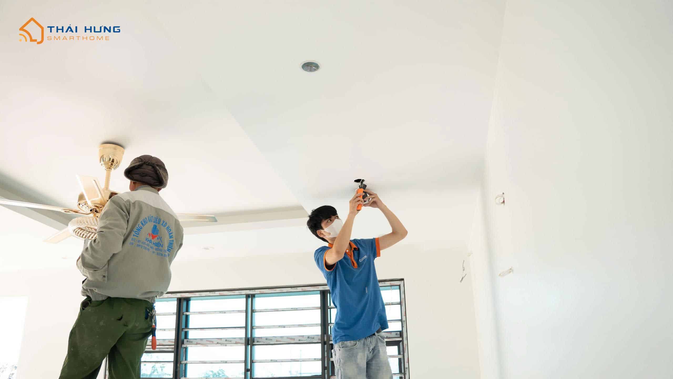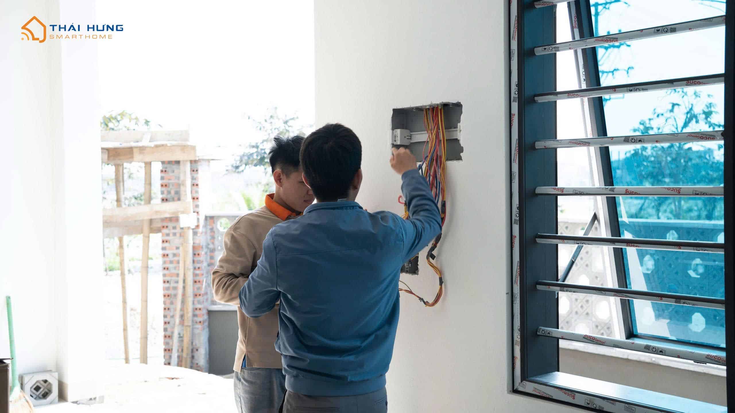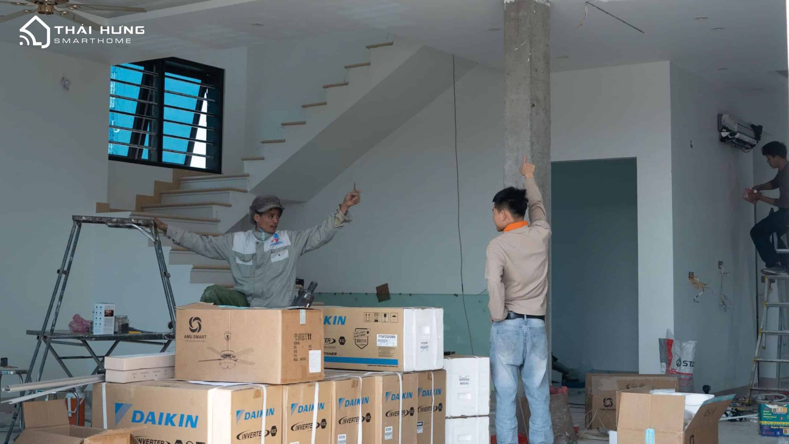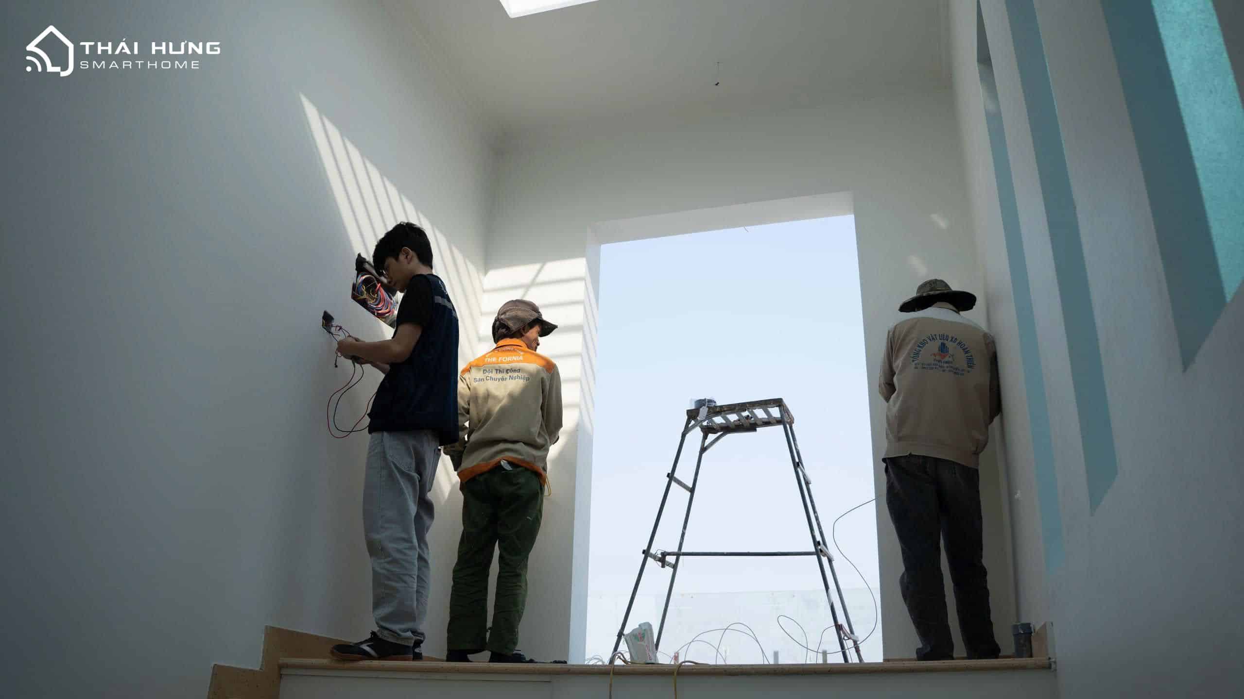 Hình ảnh đội ngũ kỹ thuật Thái Hưng Smart Home trực tiếp thi công, lắp đặt và hoàn thiện công trình nhà thông minh Aqara tại Thái Bình.